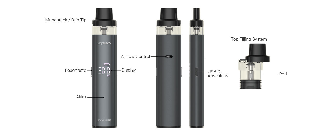 Das EVIO M Pro E-Zigaretten-Set von Joyetech setzt sich aus dem gleichnamigen Akku mit einer Kapazität von 1.100 mAh und bis zu 30 Watt Ausgangsleistung sowie dem EVIO M Pro Pod mit einem Tankvolumen von 2 Millilitern und integriertem Top Filling-System zusammen. Die Cartridge ist mit einer integrierten Coil ausgestattet, welche mit einem Widerstand von 0,6 Ohm sowohl für das moderate Dampfen vom Mund zur Lunge, als auch für restriktive Züge direkt in die Lunge geeignet ist. Die EVIO M Pro E-Zigarette wird mit geregelter Leistung betrieben. Ihr Smart Digital Display fügt sich harmonisch ins Design des Mods ein und ermöglicht es Ihnen, betriebliche Parameter wie die momentane Ausgangsleistung, den Widerstand am Verdampfer oder die Anzahl der getätigten Züge im Blick zu behalten. Gesteuert wird das Device über die Feuertaste. Der interne Akku kann über den Type C-USB-Port mit bis zu einem Ampere Ladestrom effizient geladen werden. Bitte beachten Sie, dass ein Ladekabel nicht Bestandteil des Lieferumfangs ist, bei Bedarf aber hier in unserem Shop erworben werden kann. Der Pod wird bei der Joyetech EVIO M Pro E-Zigarette durch einfaches Zusammenstecken mit dem Housing des Akkus verbunden.