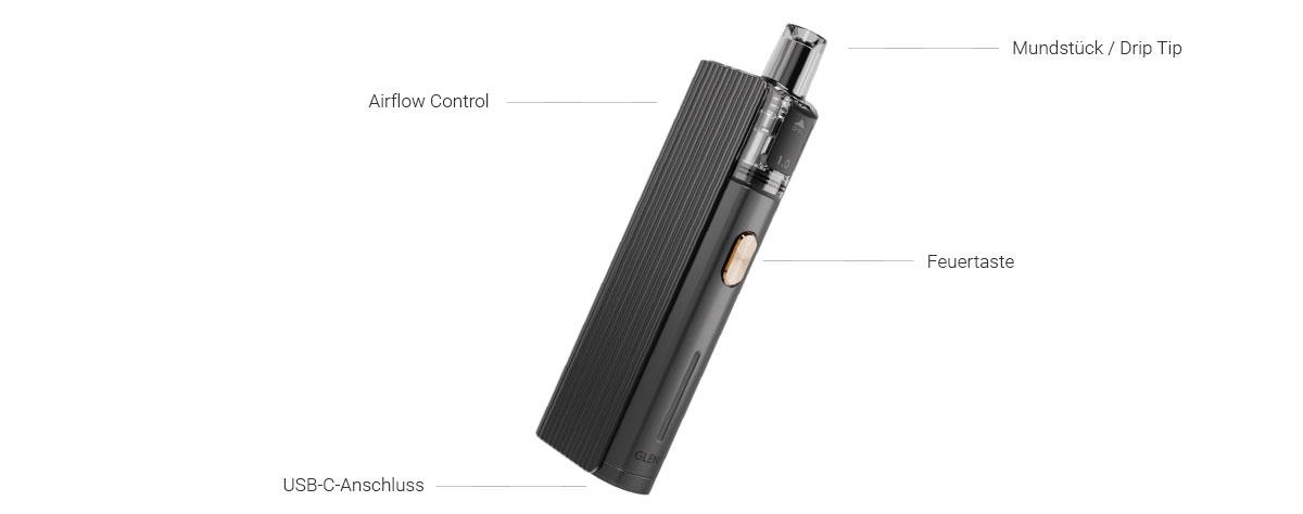 Beim GLENT E-Zigaretten-Set von Justfog trifft der gleichnamige Akku mit einer Kapazität von 1.500 mAh und einer Ausgangsleistung von bis zu 20 Watt auf den GLENT Pod mit einem Tankvolumen von 3,5 Millilitern. Die wechselbare, wiederbefüllbare Cartridge ist mit einer integrierten Mesh Coil ausgestattet, welche mit einem Widerstand von 0,6 Ohm das moderate Dampfen vom Mund zur Lunge ebenso unterstützt wie restriktive Züge direkt in die Lunge. Die Justfog GLENT wird über die Feuertaste gesteuert, aktiviert kann das Gerät optional klassisch über die Feuertaste oder intuitiv auf Zug am Mundstück werden. Dank eines Type C-USB-Ports kann der interne Akku des Devices effizient mit frischer Energie versorgt werden. Bitte beachten Sie, dass ein Type C-USB-Kabel nicht Bestandteil des Lieferumfangs ist, bei Bedarf jedoch optional in unserem Shop erworben werden kann. Die Airflow Control-Funktion der GLENT ermöglicht eine individuelle Regulierung des Zugwiderstandes. Fünf Schutzfunktionen gewährleisten einen sicheren Betrieb des Geräts. Die GLENT Cartridge wird durch einfaches Zusammenstecken mit dem Housing des Akkus verbunden.