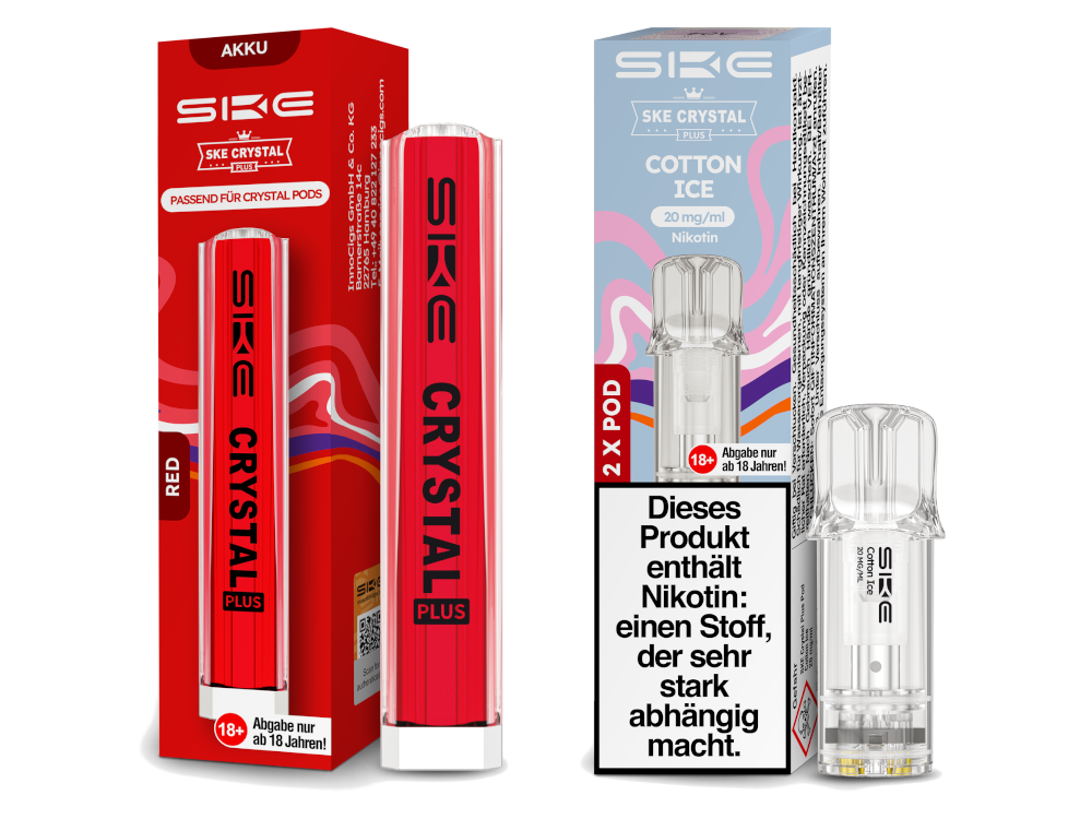 Die Crystal Plus E-Zigarette von SKE wurde speziell für die Nutzung mit den SKE Crystal Plus Pods entwickelt. Die Pods sind vorgefüllt mit 2 ml Nikotinsalz Liquid in verschiedenen Geschmacksrichtungen erhältlich und können einfach mit dem Akku verbunden werden. Wählen Sie den Crystal Plus Akku erhalten Sie eine Ausgangsleistung von 11 Watt und 400 mAh. Sie wird durch Zug am Mundstück aktiviert und zeichnet sich durch eine tastenlose, benutzerfreundliche Gestaltung aus. Der Crystal Plus MAX Akku hingegen arbeitet mit einem 850 mAh starken Akku und einer Ausgangsspannung von 3,7 Volt. Beide SKE Crystal Plus Akku´s können Sie bei Bedarf über ein USB-C Ladekabel mit neuer Energie versorgen. Beachten Sie, dass ein Ladekabel nicht im Lieferumfang enthalten ist. Die integrierte 1,1 Ohm Coil in der Cartridge unterstützt moderates Dampfen von Mund zur Lunge. Mit einer Cartridge sind je nach Zugverhalten bis zu 600 Züge möglich. Die Verbindung von Pod und Akku erfolgt durch einfaches Zusammenstecken. Wichtig zu beachten ist, dass die Crystal Plus Cartridge nicht wiederbefüllbar ist und ausgetauscht werden muss, wenn das Liquid aufgebraucht ist. Jede Verpackungseinheit enthält 2 SKE Crystal Plus Pods in der gewählten Geschmacksrichtung für eine kontinuierliche Versorgung.