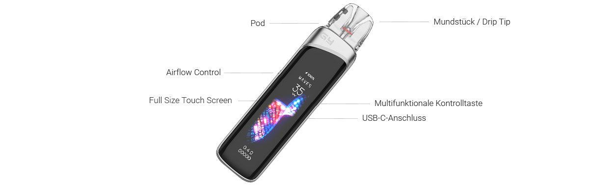 Für eine flexible Anpassung an persönliche Vorlieben verfügt die Caliburn G4 Pro über mehrere Features. Die Bedienung erfolgt über ein 2,51 Zoll großes Farb-Touchdisplay, dessen Benutzeroberfläche durch sechs verschiedene UI-Themen personalisiert werden kann. Die Aktivierung des Geräts wird durch eine optionale Zugautomatik neben dem Feuertaster flexibel gestaltet. Eine stufenlos justierbare Airflow Control ermöglicht die Regulierung des Zugwiderstands. Ein tropfenförmiges Sichtfenster am Gerät erlaubt zudem die einfache Kontrolle des Liquidstands. Die Software bietet neben den bekannten Storm- und Waves-Modi einen neuen Custom-Modus, mit dem Nutzer die Leistungskurve (Anfang, Mitte, Ende) eines Zuges selbst definieren können. Ein USB-C-Anschluss mit 2A-Ladestrom sorgt für eine schnelle Aufladung. Zudem ist das G4 Pro System abwärtskompatibel und kann auch mit den Pods der Caliburn G3 Serie verwendet werden.
