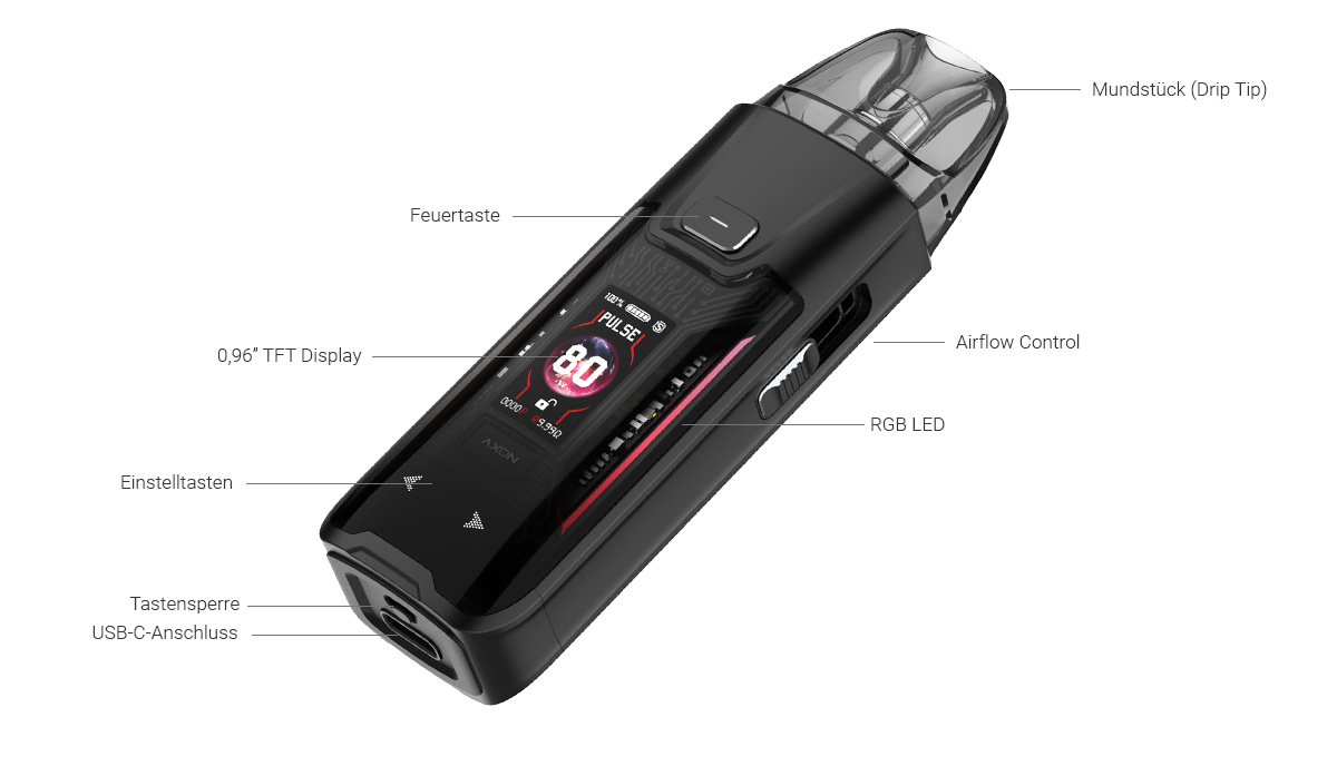 Die Energieversorgung des LUXE XR MAX 2 Akkus erfolgt durch einen integrierten Akku mit einer Kapazität von 3.200 mAh. Gesteuert vom AXON Chipsatz, kann die E-Zigarette eine maximale Ausgangsleistung von 80 Watt erreichen. Ihnen stehen die Ausgabemodi Eco, Smart, Pulse zur Verfügung. Geladen wird der Akku über den USB-C-Anschluss mit einem Ladestrom von bis zu DC 5V / 2A. Die Abmessungen des Geräts betragen 108 mm in der Höhe, 32,1 mm in der Breite und 26,4 mm in der Tiefe.