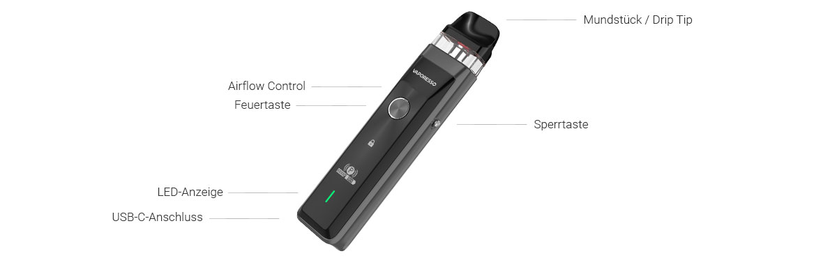 Die von einem AXON-Chipsatz gesteuerte XROS Pro aus dem Hause Vaporesso kann in unterschiedlichen Ausgabemodi genutzt werden. Drücken Sie die Feuertaste drei Mal in schneller Folge, um den gewünschten Betriebsmodus auszuwählen bzw. die Ausgangsleistung entsprechend anzupassen. Durch zweimaliges Drücken der Feuertaste lassen sich Lichteffekte steuern, während das viermalige Drücken der Taste kurz hintereinander den Zugzähler zurücksetzt. Nach Angaben des Herstellers kann der integrierte Akku mit einer Kapazität von 1.200 mAh innerhalb von 35 Minuten vollständig aufgeladen werden. Verbinden Sie Ihr Gerät dazu über das mitgelieferte USB-Type C-Kabel mit einer geeigneten Stromquelle wie dem PC oder Laptop. Über die an der Seite des Devices befindliche Lock-Taste kann die E-Zigarette gesperrt werden, um eine unbeabsichtigte Aktivierung, beispielsweise während des Transports, zu verhindern. Die Aktivierung auf Zug am Mundstück ist auch dann möglich, wenn das Gerät mittels der Lock-Taste gesperrt ist.